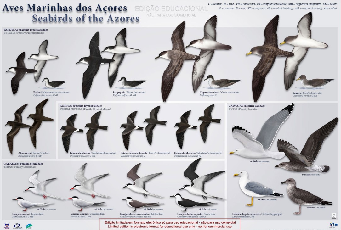 Cartaz com as aves marinhas dos Açores. Cada uma das ilustrações tem o nome cien...